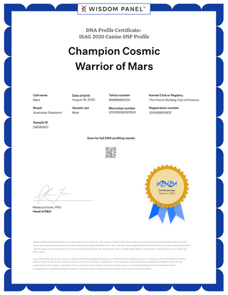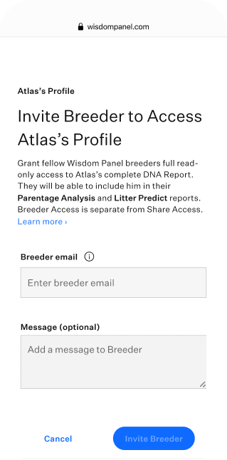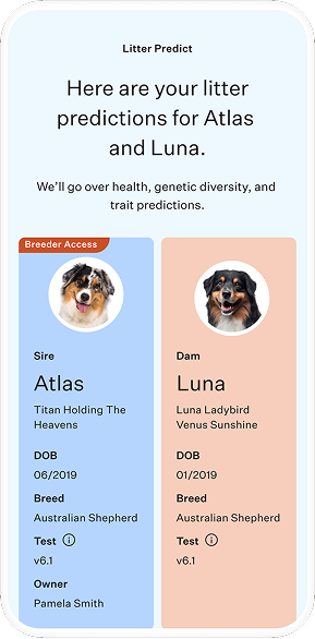 Streamline your genetic testing with an all-in-one bundle. With one simple cheek swab, you'll get the MyDogDNA™ genetic testing panel plus an ISAG 2020 DNA profile, with complimentary self-service parentage testing (potential parents and offspring must have Wisdom provided ISAG 2020 DNA profiles within your account). You’ll also be able to forecast genetic outcomes with Litter Predict and share results with other breeders through Breeder Access.